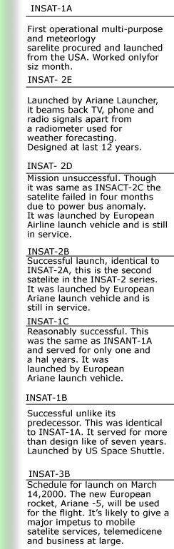 ven otherwise, INSAT is now among the largest domestic satellite systems in Asia. Currently, there are five operational satellites in orbit with 63 transponders working. The sudden loss of INSAT 2D had curtailed VSAT operations of several private operators. It had also put brakes on the expansion plans of both the Department of Telecommunications (DOT) and Doordarshan. Being the main INSAT users, both the bodies predict a demand of nearly 120 transponders by 2002. The need for move satellites becomes more imperative with both INSAT-1D and 2A nearing their end. Already, last year's INSAT-2E is billed as India's most sophisticated indigenously-built communications satellite so far. It comes with the latest in transponder technology to beam back TV, phone and radio signals, apart from a powerful radiometer used for weather forecasting. Already, 11 of its 17 transponders have been leased out to Intelsat for the next 10 years at a fee of Rs. 42 crore per year. It is designed to last 12 years compared to seven in the case of other INSAT series satellites.