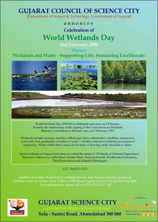 The Gujarat Science City, working under the aegis of Department of Science & Technology, Govt of Gujarat, is celebrating the World Wetlands Day on 2nd February 2006 on the theme 'Wetlands and Water - Supporting Life, Sustaining Livelihoods'. The celebration aims to raise public awareness of wetland values and benefits and promote the conservation and wise use of wetlands.