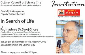 The first lecture in this series has been planned as In Search of Life on 31st May 2006 at 5.00 pm and to be delivered by Padmashree Dr. Saroj Ghose, the past President of the International Council of Museums in Paris (1992-98), past Chairman of the Science Centre World Congress (1996-99), and retired Director General of the National Council of Science Museums of India (1979-97)