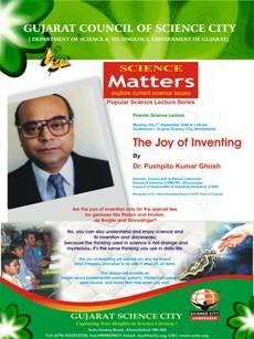 The Gujarat Science City is announcing the popular science lecture on the topic "The Joy of Inventing" to be delivered by Dr. Pushpito Kumar Ghosh, Director Central Salt & Marine Chemicals Research Institute (CSMCRI), Bhavnagar on the Saturday, the 2nd September 2006 at 3.00 pm in Auditorium I.