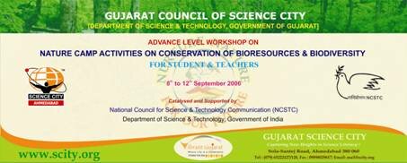 The Gujarat Council of Science City (GCSC) is organizing a five days Workshop on Nature Camp Activities on Conservation of Bioresources and Biodiversity for Teachers and Students from 8th to 12th September 2006. The workshop has been catalyzed and supported by National Council for Science and Technology Communication (NCSTC), Department of Science & Technology, Govt of India.