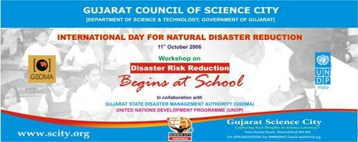 Gujarat Science City is celebrating the International Day for Reduction of Natural Disaster (IDRND) on 11th October 2006 to increase understanding and awareness about various natural disasters and its mitigation plans. The programme has been designed in association with Gujarat State Disaster Management Authority (GSDMA) and UNDP Gujarat State Project Office, Gandhinagar.
